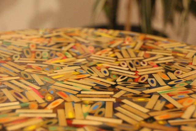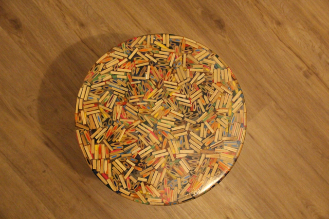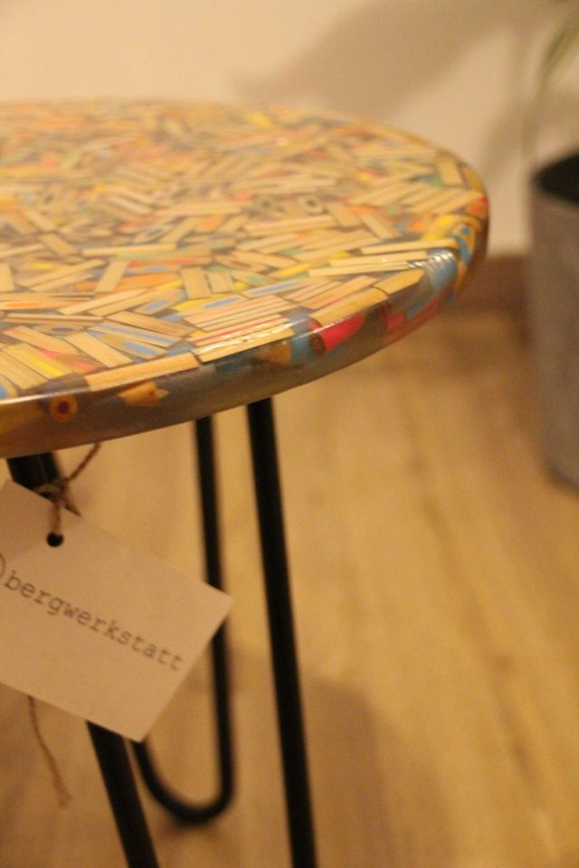 Ein Designstück, das Geschichten erzählt: Für diesen besonderen Beistelltisch werden hunderte farbige Buntstiftreste Schicht für Schicht von Hand arrangiert und anschließend in hochwertiges Epoxidharz eingegossen und plangefräst. So entsteht eine stabile, glänzende Oberfläche voller lebendiger Muster, Farben und Strukturen – jedes Stück ein echtes Unikat.